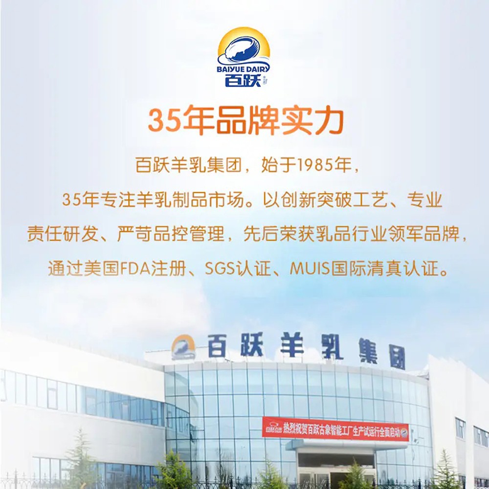 西安百躍羊乳集團(tuán)有限公司是一家集羊乳研發(fā)、收購(gòu)、生產(chǎn)、銷(xiāo)售于一體的集團(tuán)化公司。成立于1985年,位于西安市閻良區(qū),主要從事羊乳制品的研發(fā)、生產(chǎn)、銷(xiāo)售和服務(wù),具有自建奶源基地,是國(guó)內(nèi)規(guī)模最大的羊乳加工企業(yè)。目前,已發(fā)展成一家擁有多個(gè)子公司的集團(tuán)化企業(yè),擁有百躍羊乳(合水)古象有限公司、百躍羊乳(南寧)有限公司、西安國(guó)品乳業(yè)有限公司、西安御恭羊乳有限公司、西安御寶羊乳品營(yíng)銷(xiāo)有限公司,及控股公司陜西百躍優(yōu)利士乳業(yè)有限公司,F(xiàn)有職工238人,總資產(chǎn)達(dá)10 億元,無(wú)負(fù)債。