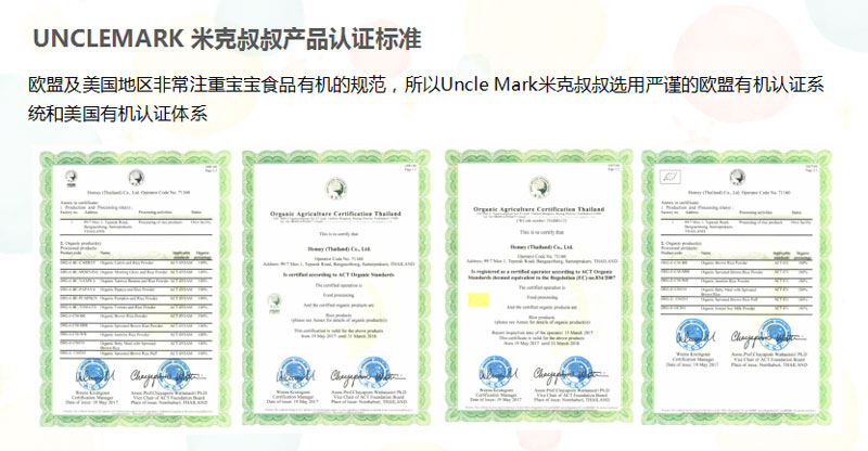 3.吃進肚子里的必須是安全的,米克叔叔產(chǎn)品已通過歐盟有機認證、美國有機認證、質(zhì)量管理體系認證、國際食品安全認證、優(yōu)良制造標準認證等相關(guān)國際認證。