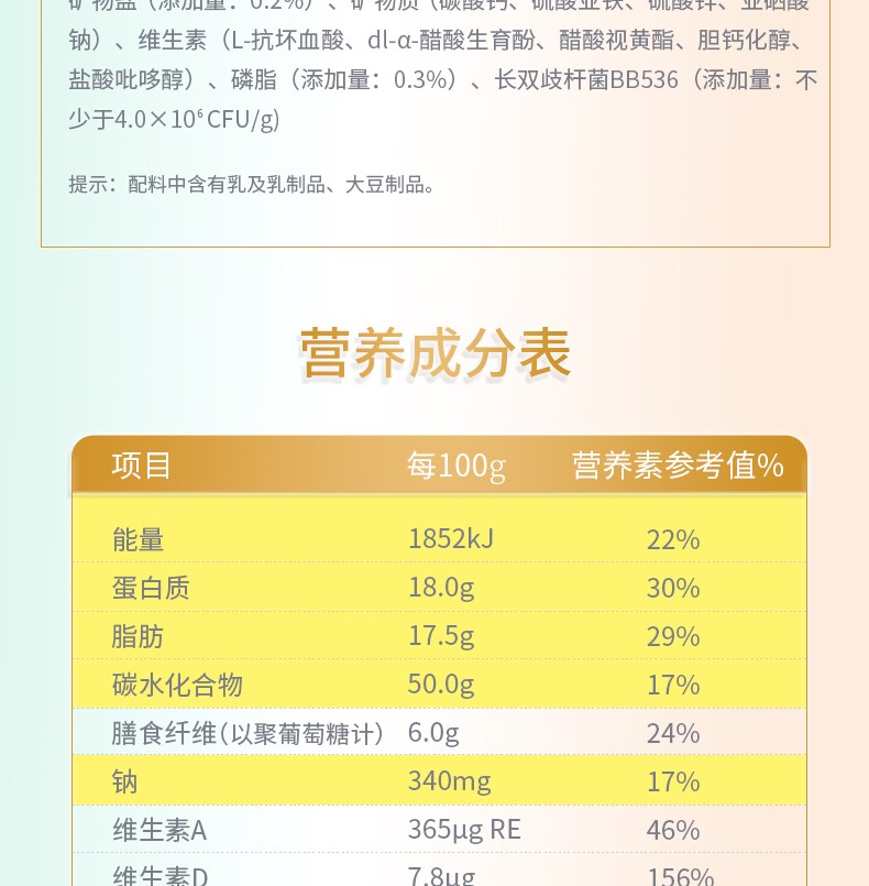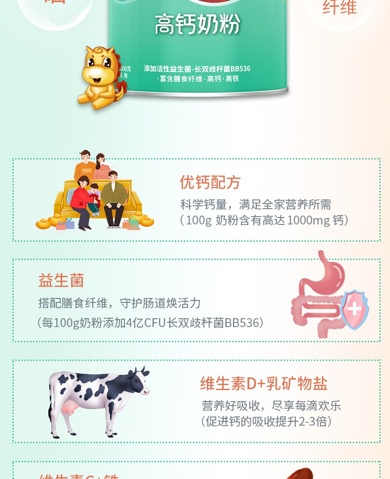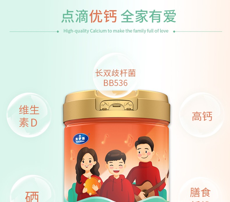 太子樂(lè)高鈣奶粉定制日常膳食中缺乏的各種營(yíng)養(yǎng)元素,長(zhǎng)雙歧桿菌BB536、鈣、硒、膳食纖維等,科學(xué)配比鈣含量,滿足全家營(yíng)養(yǎng)所需。