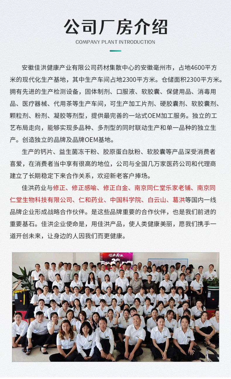 安徽佳洪健康產(chǎn)業(yè)有限公司位于全球最大的中藥材集散中心安徽亳州市,占地4600平方的現(xiàn)代化生產(chǎn)基地,其中生產(chǎn)車間占地2300平。倉儲面積2300平。國際先進的生產(chǎn)檢測設備,固體制劑、口服液、軟膠囊、保健用品、消毒用品、醫(yī)療器械、代用茶等生產(chǎn)車間,可生產(chǎn)加工片劑、硬膠囊劑、軟膠囊劑、顆粒劑、粉劑、凝膠等劑型,提供最完善的一站式OEM加工服務。獨立的工藝布局走向,能夠實現(xiàn)多品種、多劑型的同時聯(lián)動生產(chǎn)和單一品種的獨立生產(chǎn)。創(chuàng)造獨立的品牌及品牌OEM基地。