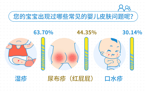 嬰幼兒常見皮膚問題有濕疹、皮炎、蕁麻疹、口水疹、紅屁股、紅臀、痱子(熱疹)、膿皰疹、過敏、奶疹、急疹(嬰兒玫瑰疹)、痤瘡,而出現(xiàn)最多的屬濕疹、尿布疹(紅屁屁)、口水疹。