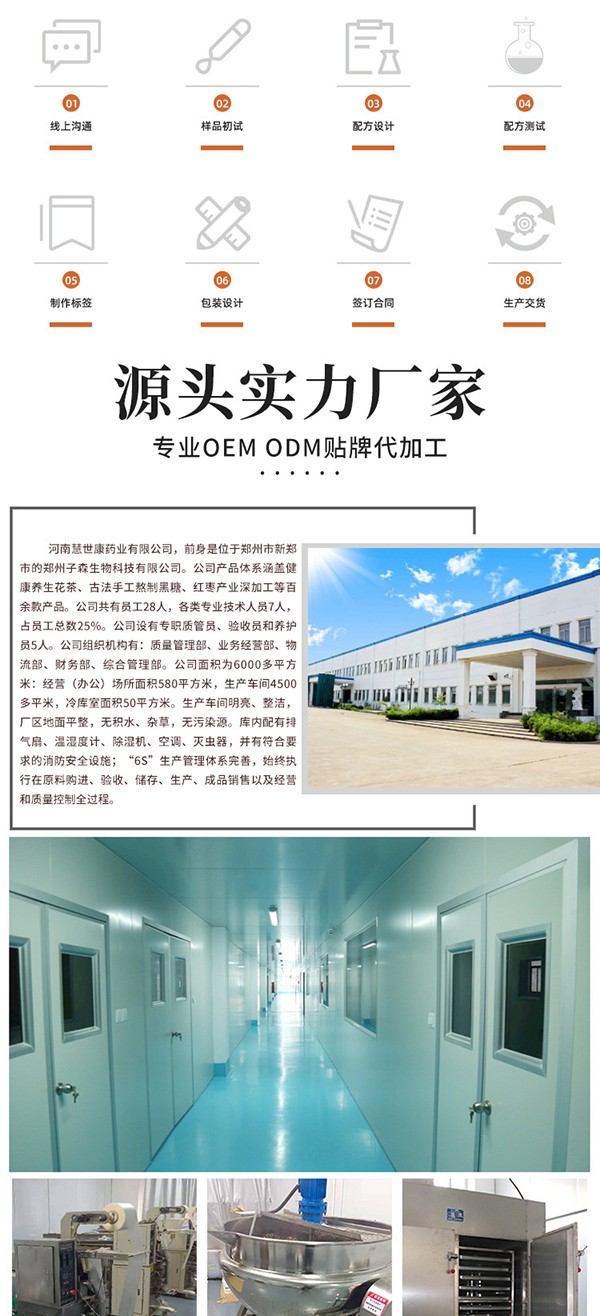 河南慧世康藥業(yè)有限公司,前身是位于鄭州市新鄭市的鄭州子森生物科技有限公司。公司產(chǎn)品體系涵蓋健康養(yǎng)生花茶、古法手工熬制黑糖、紅棗產(chǎn)業(yè)深加工等百余款產(chǎn)品。公司共有員工28人,各類專業(yè)技術人員7人,占員工總數(shù)25%。公司設有專職質(zhì)管員、驗收員和養(yǎng)護員5人。公司組織機構有:質(zhì)量管理部、業(yè)務經(jīng)營部、物流部、財務部、綜合管理部。公司面積為6000多平方米:經(jīng)營(辦公)場所面積580平方米,生產(chǎn)車間4500多平米,冷庫室面積50平方米。生產(chǎn)車間明亮、整潔,廠區(qū)地面平整,無積水、雜草,無污染源。庫內(nèi)配有排氣扇、溫濕度計、除濕機、空調(diào)、滅蟲器,并有符合要求的消防安全設施;“6S”生產(chǎn)管理體系完善,始終執(zhí)行在原料購進、驗收、儲存、生產(chǎn)、成品銷售以及經(jīng)營和質(zhì)量控制全過程。
