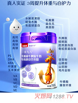 據(jù)悉,貝因美特愛牛牛一米九八乳酸菌牛脾肽兒童奶粉擁有中國(guó)發(fā)明專利(ZL201811503284.0),專為3-15歲兒童定制,匯聚多重營(yíng)養(yǎng)優(yōu)勢(shì)。每罐添加≥700億CFU復(fù)合益生菌,涵蓋六種乳酸菌,搭配500mg/100g牛脾肽粉,同時(shí)添加核桃肽、骨膠原蛋白肽三種小分子肽,輔以山楂粉等四種藥食同源成分,兼顧營(yíng)養(yǎng)與溫和適配。